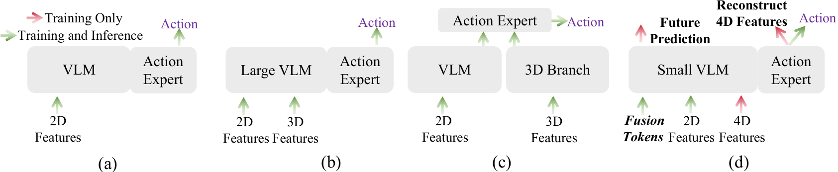 (a) Using only 2D features as input to the VLM, which results in limited spatiotemporal awareness. (b) Direct fusion approaches combine spatial and 2D features within large VLMs. (c) Decoupled designs that introduce a dedicated spatial branch, causing large parameter overhead. (d) SwiftVLA leverages a pretrained model to extract 4D features and applies a feature reconstruction objective to align 4D and 2D representations. In addition, Fusion Tokens and a future prediction objective are introduced to strengthen cross-modal integration. The 4D inputs and auxiliary heads are removed at inference to maintain efficiency.