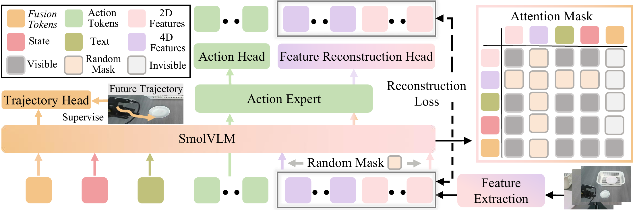 (2) It fuses 2D and 4D features in a lightweight VLM via learnable Fusion Tokens , trained with supervision from the robot arm's future end-effector trajectory to produce a unified, action-aware representation;